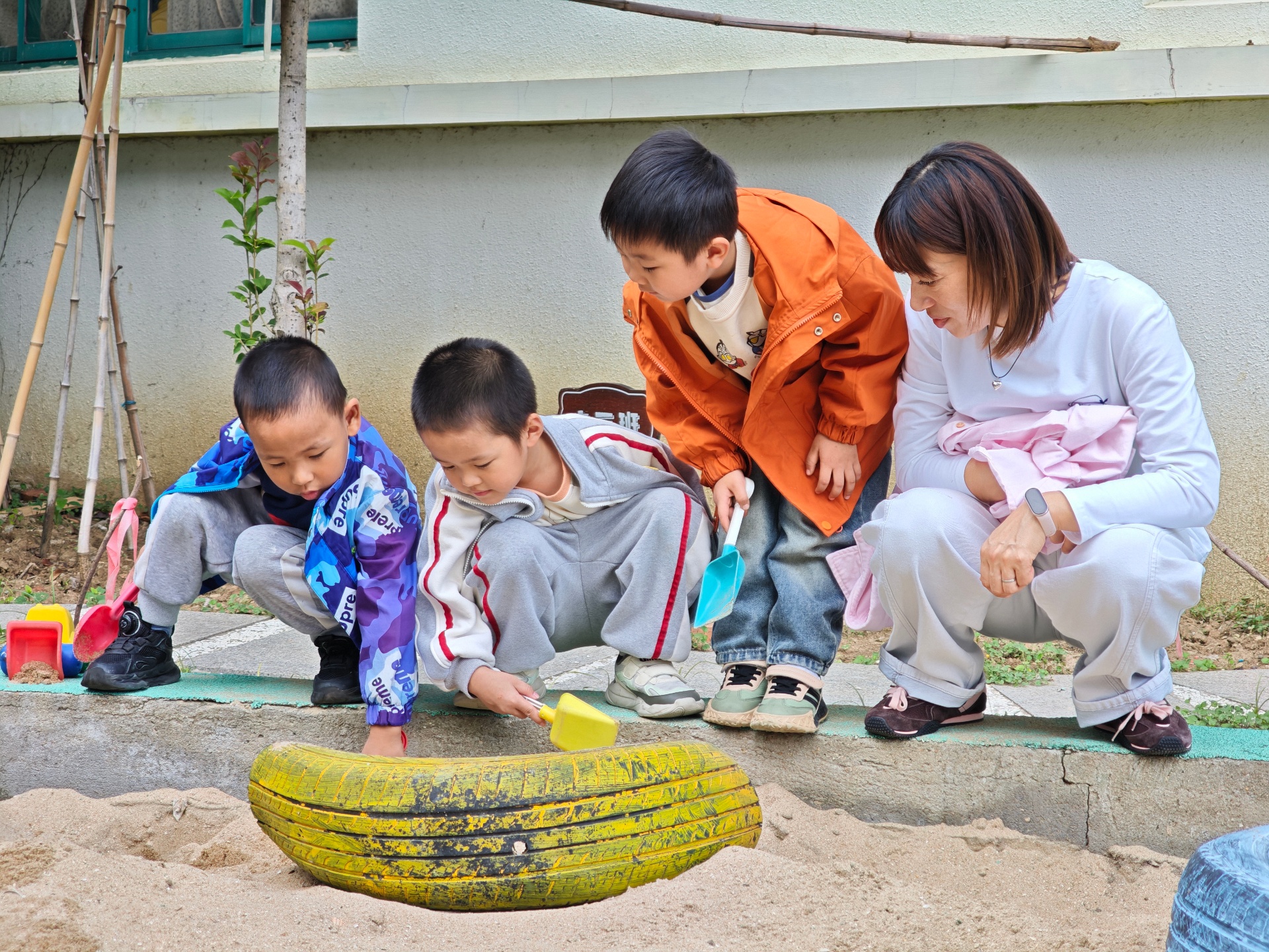 户外的沙池旁,三位小朋友正围着黄色轮胎专注地玩沙探索,一旁的老师温柔地蹲下身,和孩子们一同俯身观察。孩子们拿着小铲子,小手在沙堆里认真地拨弄、挖掘,眼神里满是好奇与投入;老师则静静陪伴,目光落在孩子们的动作上,满是温柔与耐心。沙池边的这一幕,藏着童真的探索欲,也透着师幼互动的温暖。