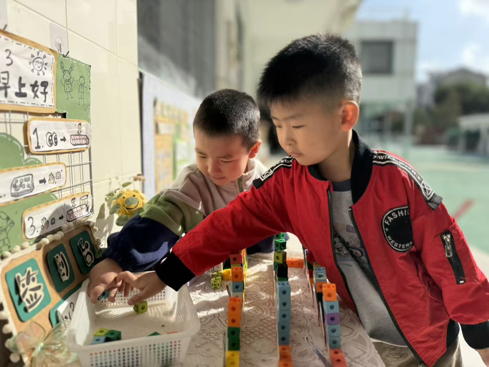 伴随着清晨的阳光,瑞瑞和晨晨专注地进行自主签到,他们伸手挑选积木块,阳光洒在桌面,画面满是协作的童趣。小小的手相互配合,每一次积木的堆叠,都是他们想象力与合作力的展现。