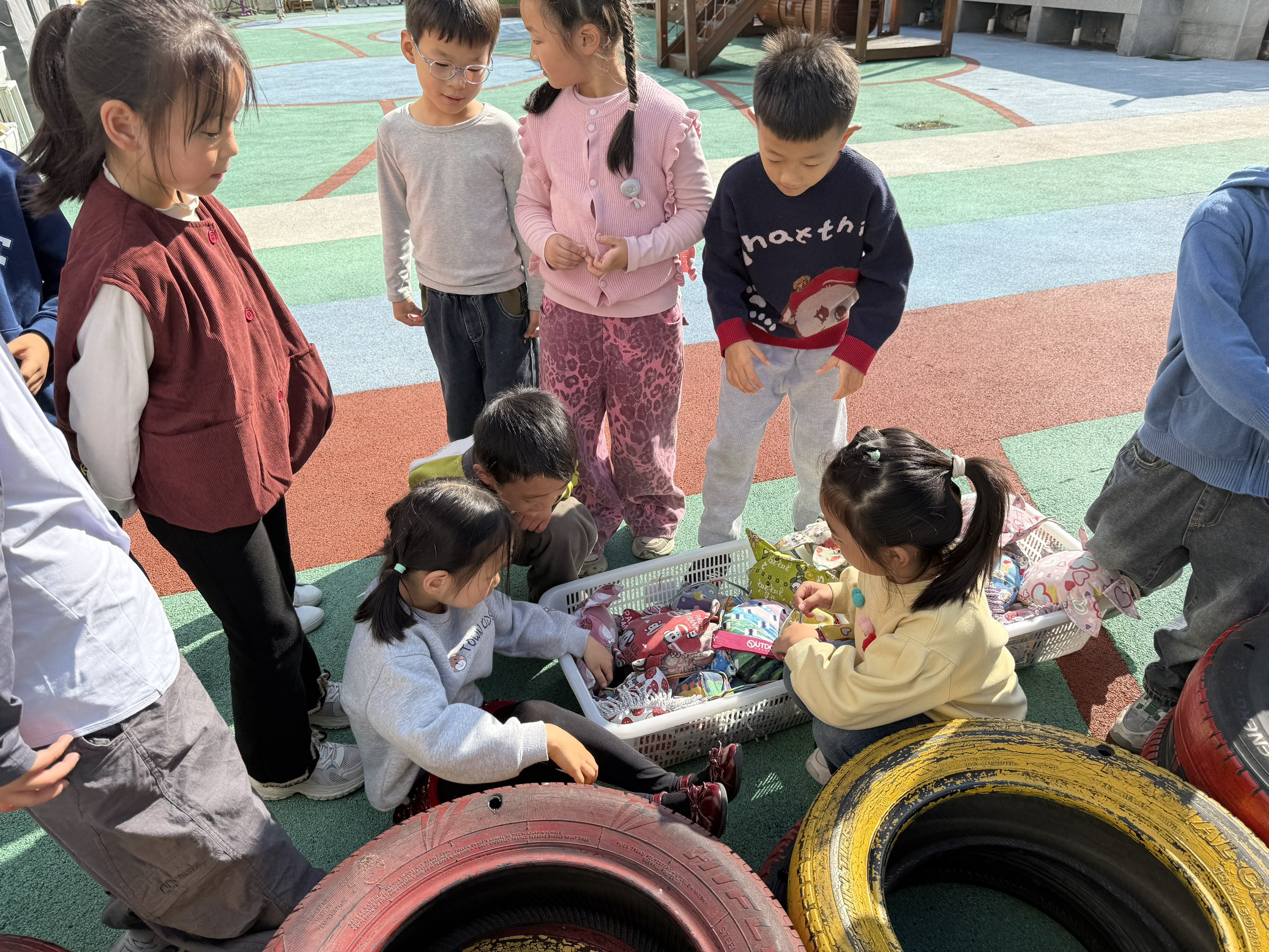 孩子们围在道具筐前,蹲坐的孩子正认真挑选装备,站立的小伙伴们伸着脖子张望,眼神里满是期待。突然,两个孩子为了抢一个迷彩袖章起了小争执,旁边的小伙伴立刻围过来,七嘴八舌地帮忙出主意,最后大家决定用 “石头剪刀布” 的方式公平分配。一场小小的风波在笑声中化解,孩子们也在游戏中学会了沟通与包容。