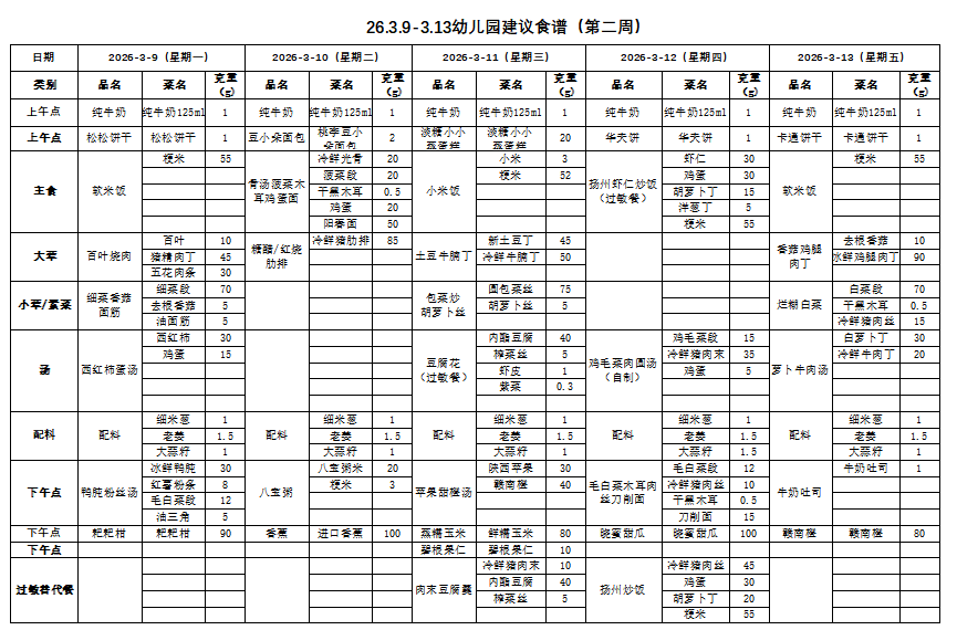 26.3.9-3.13幼儿园建议食谱(第二周)