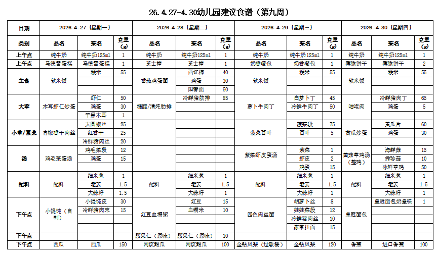 26.4.27-4.30幼儿园建议食谱(第九周)